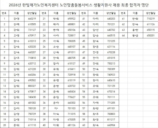 2026년 한빛재가노인복지센터 노인맞춤돌봄서비스 수행인력(생활지원사) 채용 명단 공고 페이지 정보 작성자 한빛관리자 작성일25-12-29 16:38 조회59회 댓글0건 관련링크 이전글 다음글 목록 본문 한빛재가노인복지센터에서는 2026년 노인맞춤돌봄서비스 수행인력(생활지원사) 합격자 명단을 위와 같이 공고 합니다. 이전글 다음글 목록